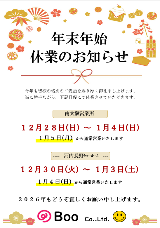 休業期間:2025年12月30日(火)〜2026年1月3日(土)